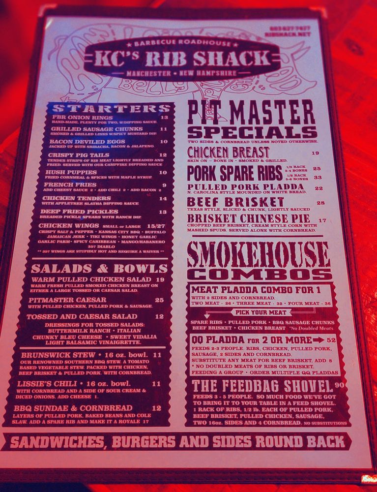 Introducing KC's Rib Shack, a lively cocktail bar and BBQ spot in Manchester, NH. With a wide array of amenities like outdoor seating, happy hour specials, and even a drive-thru, KC's is a go-to spot for a fun night out. The menu boasts delicious appetizers like bacon devil eggs and hearty sandwiches like the Pulled Pork Sandwich. Customers rave about the flavorful ribs, kielbasa, and brisket. The ambiance is welcoming, with a barn-like vibe and colorful decor. KC's Rib Shack is a must-visit for those craving top-notch BBQ and a lively atmosphere. With rave reviews from loyal customers, this joint promises a memorable dining experience. Experience the best of Manchester and New Hampshire's BBQ scene at KC's Rib Shack.